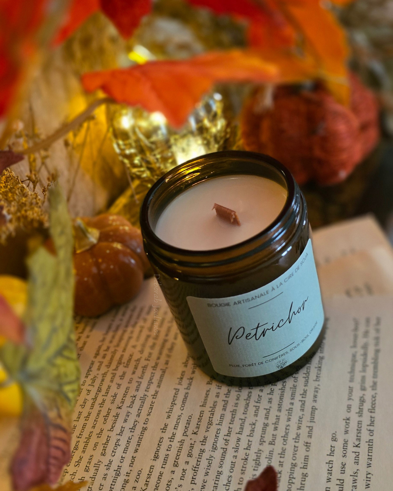 Une bougie pour les amoureux de la pluie, des temps orageux, pour qui grisaille rime avec cocooning. Elle mêle des notes de pluie, d'orage d'été, de terre mouillée dans une forêt de conifères, où la mousse et les écorces sont gorgés de cette magie qu'est le petrichor.